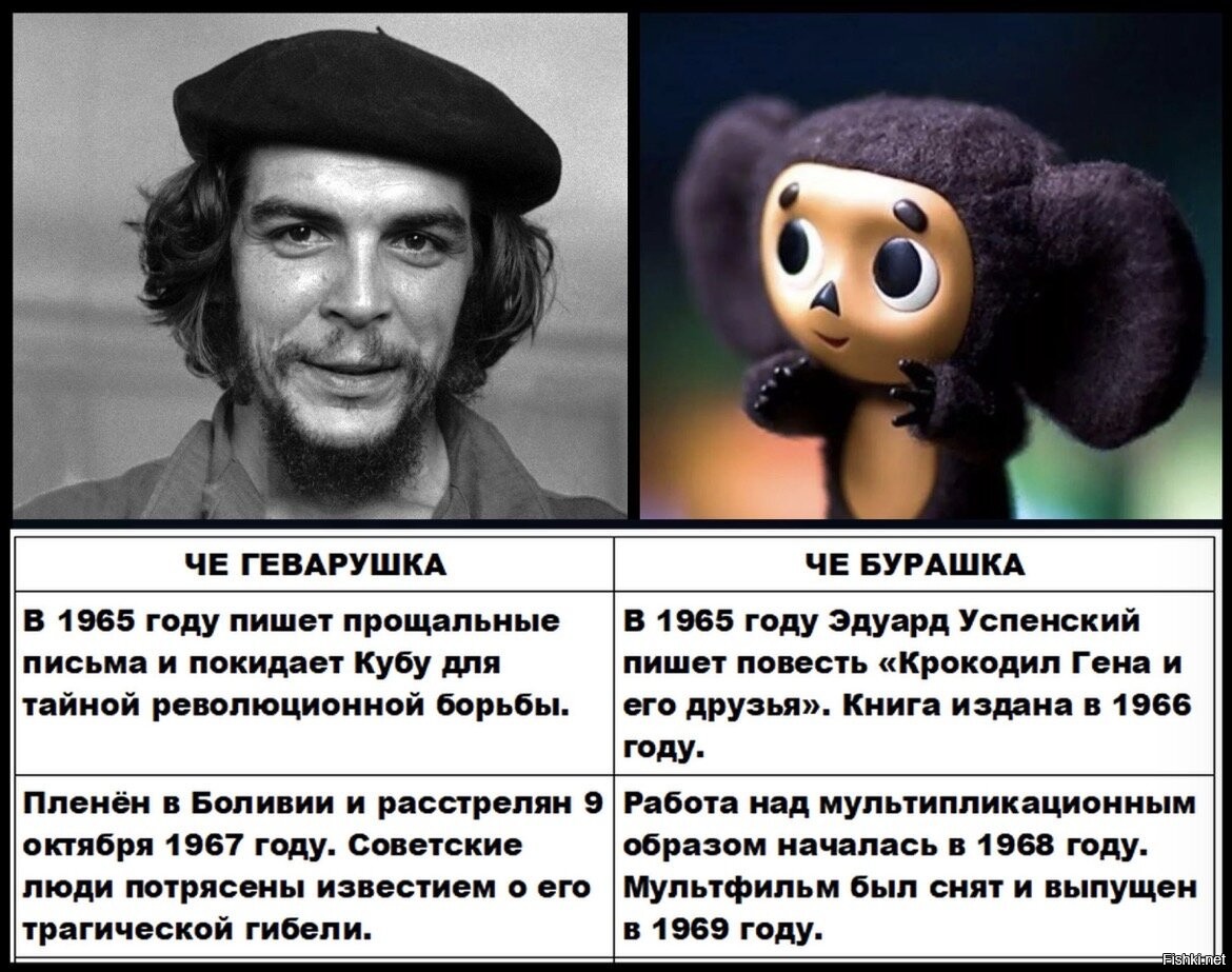 Именно поэтому в СССР были частыми шутки, что Чебурашка это местный Че Гевара. Конечно, и созвучие этих слов тоже имеет место быть, что говорит о возможном родстве мохнатого ушастого зверька с кубинским революционером (Че был родом из Аргентины, если что).