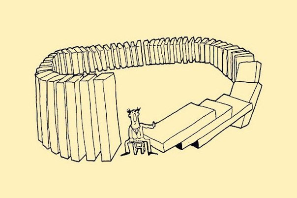 Когда Роналд пролетал мимо окна восьмого этажа, в его голову из комнаты попал заряд дроби, выпущенный жильцом на восьмом этаже. Пока полиция доставала труп с сетки и устанавливала личность покойного с почти полностью снесенной выстрелом головой, детективы решили, что стрелявшему - нужно предъявлять обвинение в непредумышленном убийстве. Ведь если бы он не выстрел, Роналд Опус остался жив, упав на сетку.