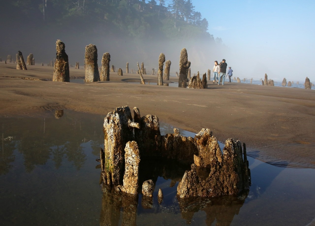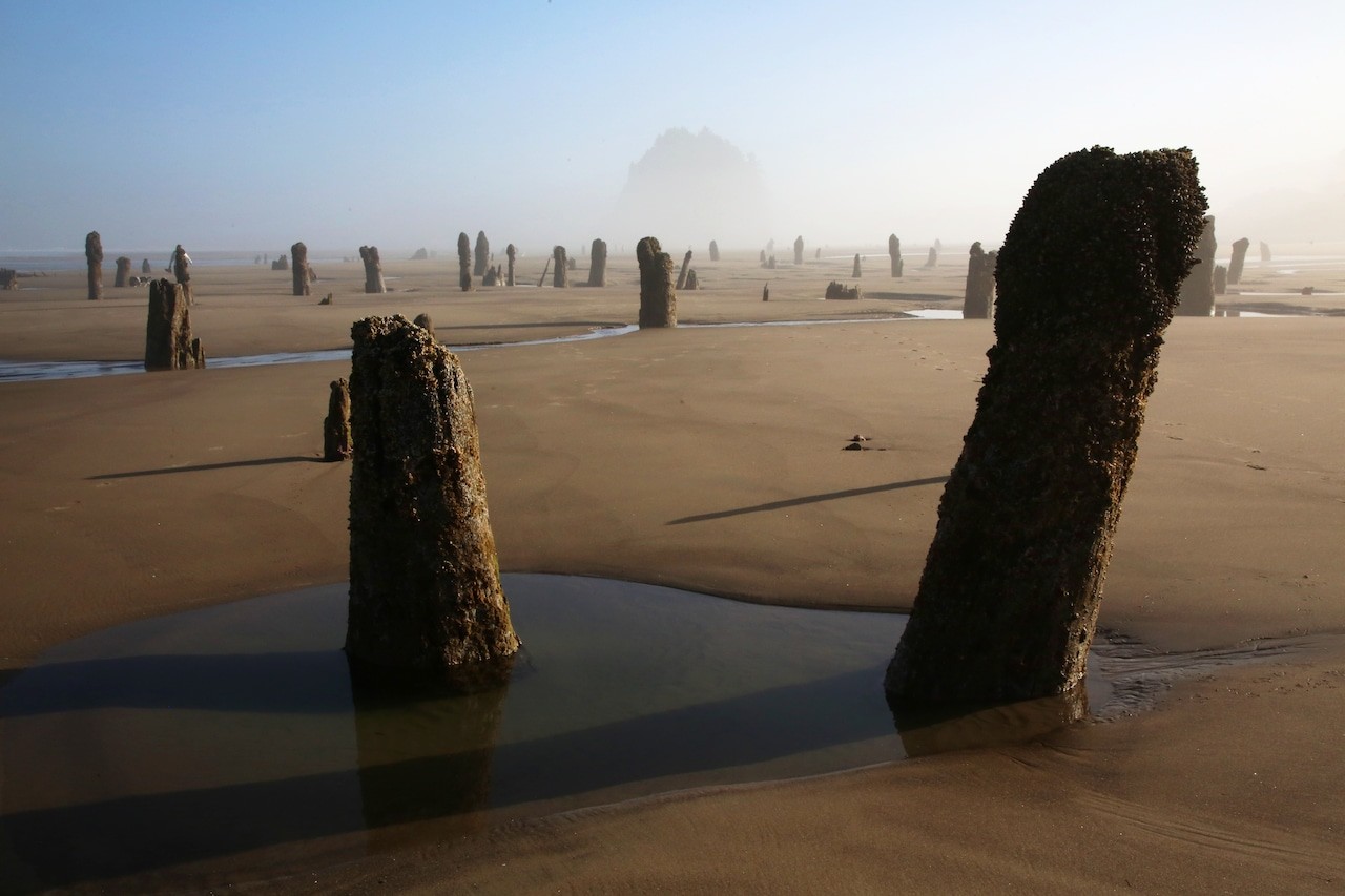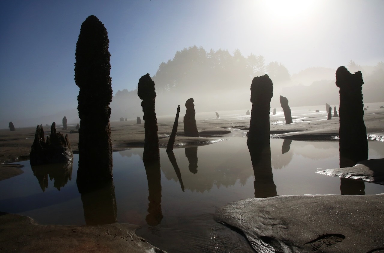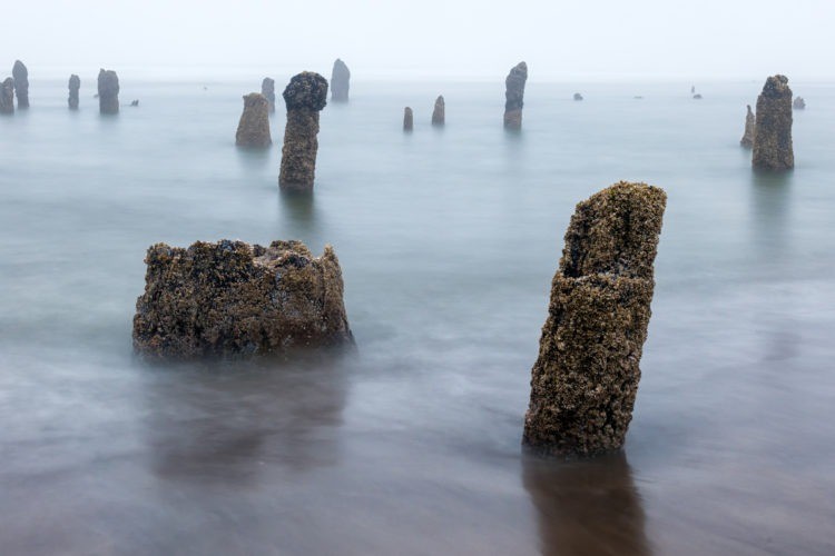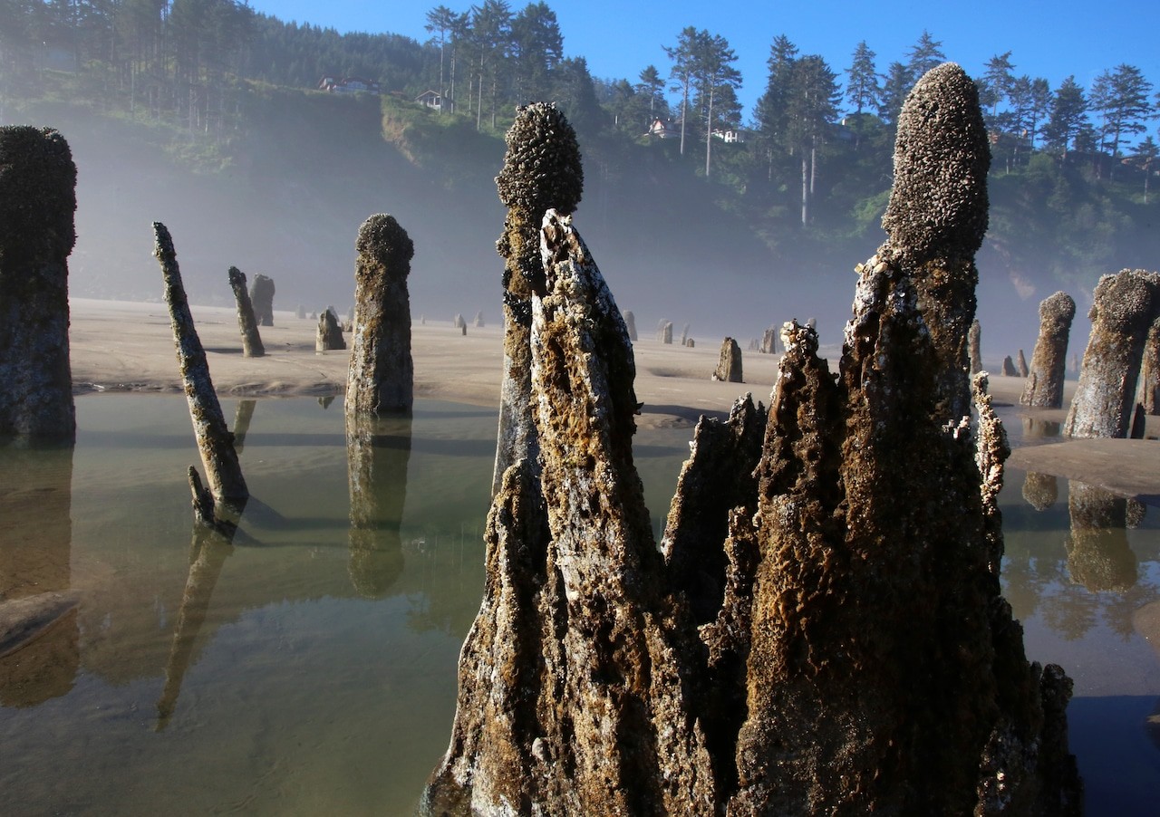На побережье Тилламук в штате Орегон из песка и морской воды поднимаются около сотни древних прогнивших пней, словно несущих вечную вахту.