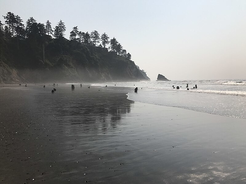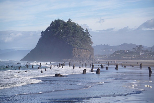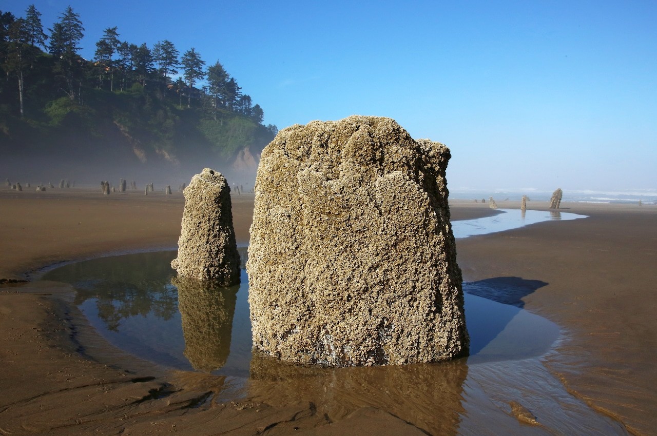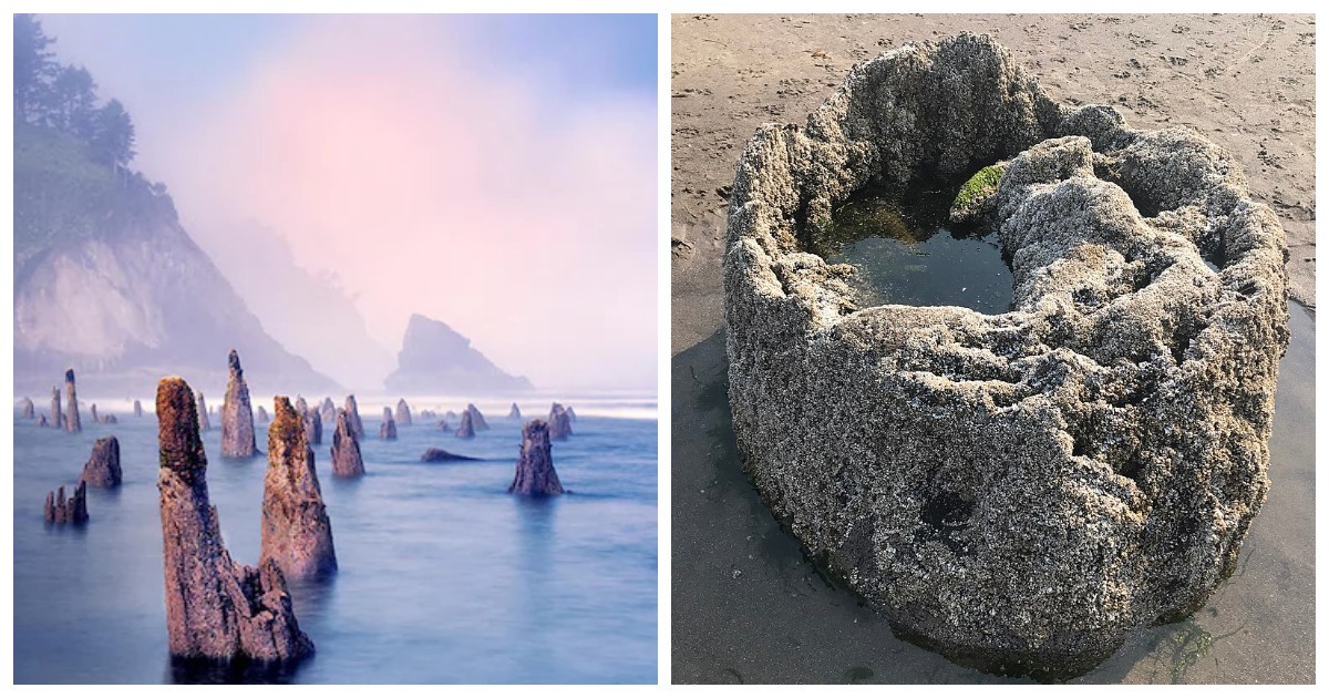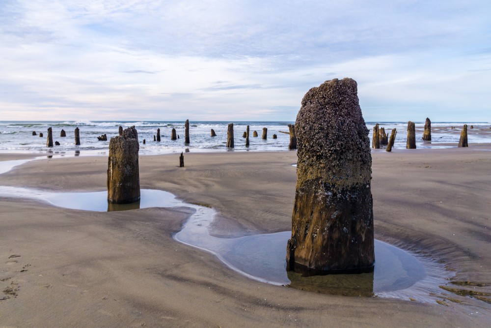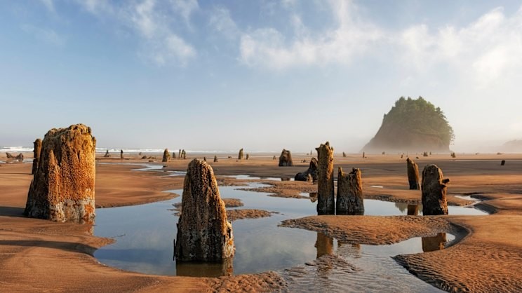 На побережье Тилламук в штате Орегон из песка и морской воды поднимаются около сотни древних прогнивших пней, словно несущих вечную вахту.
