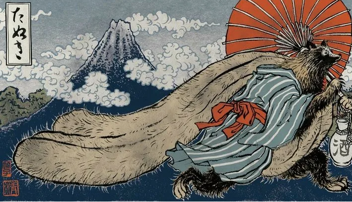 Тануки – известные оборотни (как и лисы) в японской мифологии. Они обожают превращаться в человека, посещать бар или бордель, а расплачиваться там осенними листиками, запудривая голову владельцу, что это золото. А чтобы плавать по рекам, они раздувают свои шары до размеров плавательного матраса. Если надо – сидят на них поудобнее, или накидывают, как плащ.