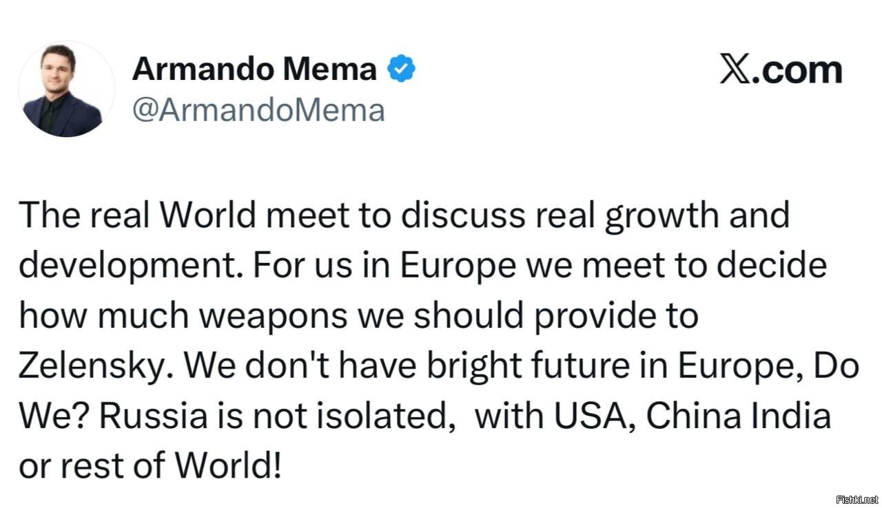 Представители реального мира встречаются, чтобы обсудить рост и развитие. Мы, европейцы, встречаемся, чтобы решить, сколько оружия мы должны предоставить Зеленскому. У нас в Европе нет светлого будущего, не так ли? Россия не изолирована ни от США, ни от Китая, ни от Индии, ни от остального мира!