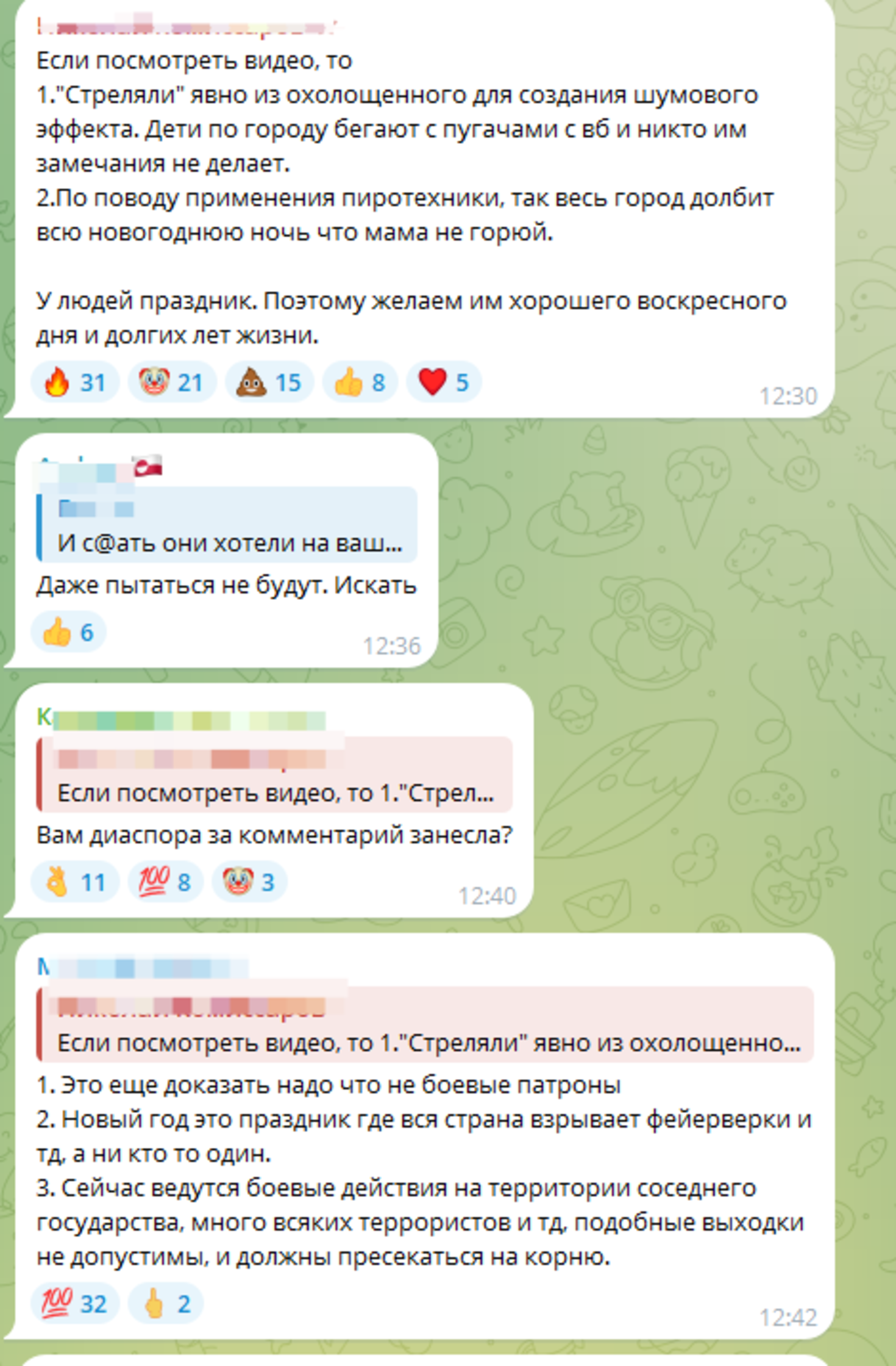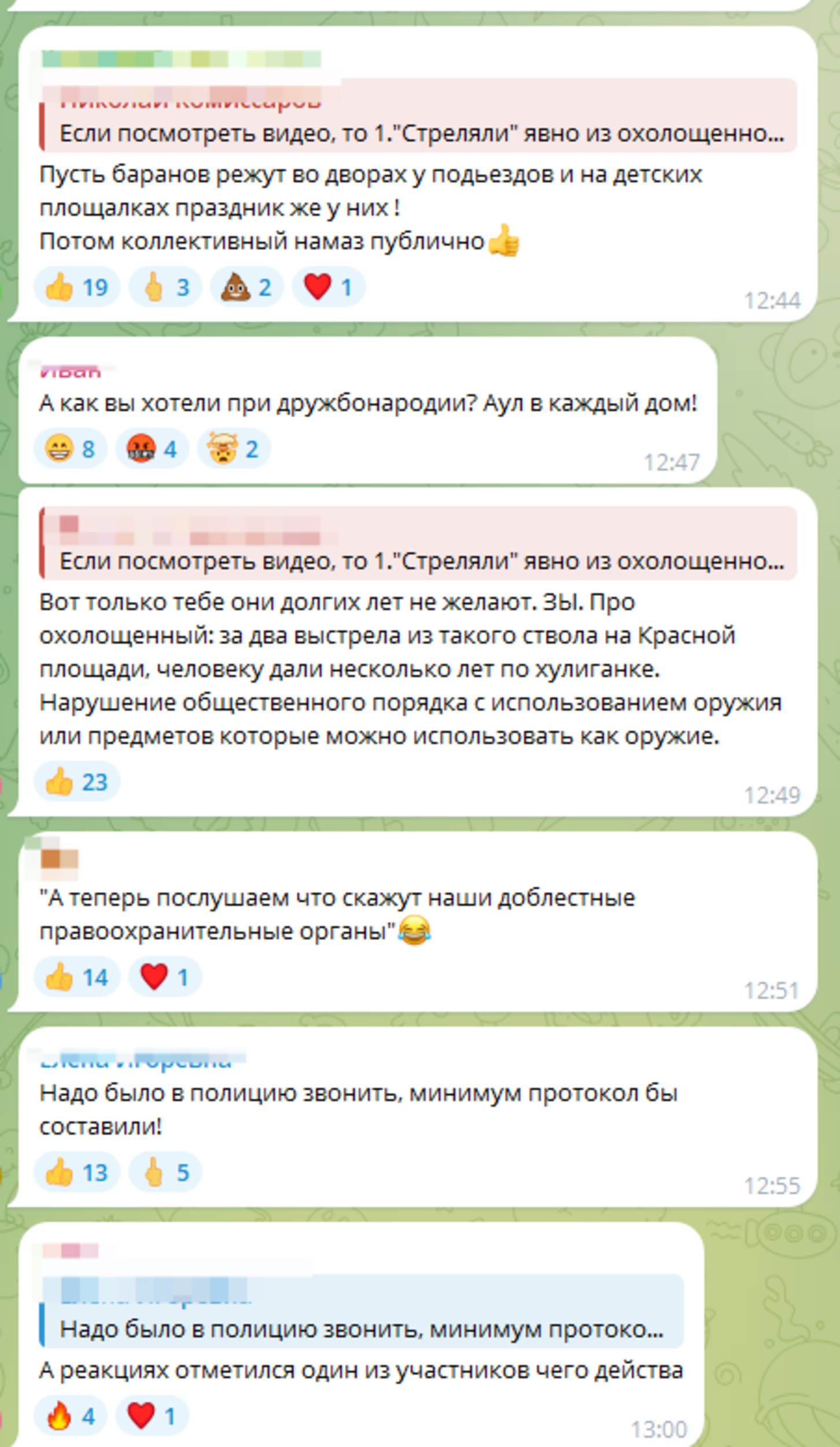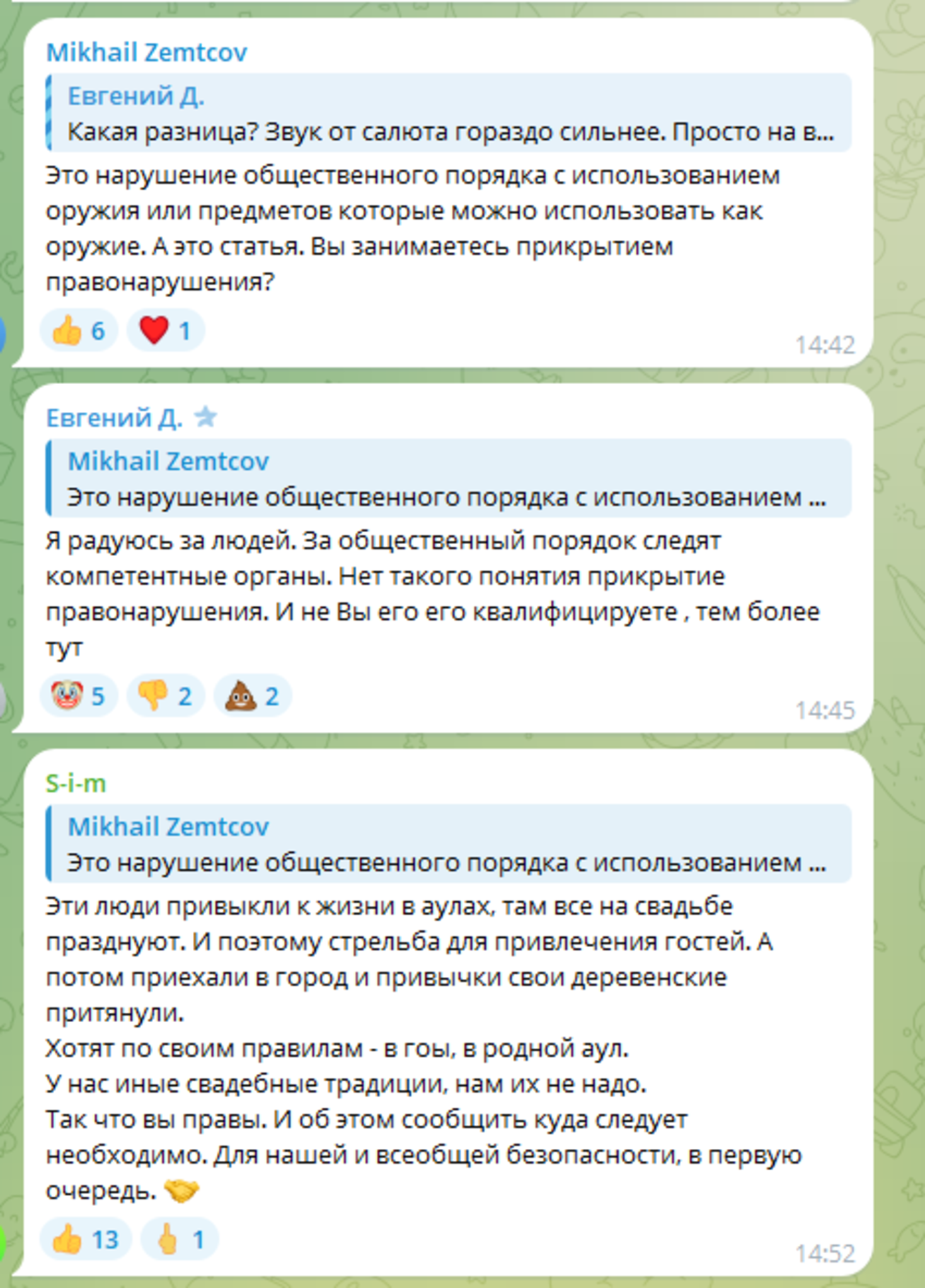 В Телеграм-канале "Чехов Вид" развернулась настоящая дискуссия по поводу произошедшего. Одни желали счастья молодым и настаивали, что ничего страшного не произошло - подумаешь, постреляли немного. Другие категорически не согласились с этим мнением: стрельба, пусть и из охолощенного оружия считается нарушением порядка, и за это нужно отвечать.