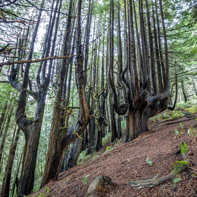 Они не погибали, а продолжали свой рост, выпуская новые побеги из повреждённых стволов. Так, столетие за столетием, сформировались эти причудливые формы, напоминающие гигантские подсвечники. Сотрудники организаций по охране краснокнижных лесов признаются, что нигде более не встречали секвой, изогнутых столь причудливым образом.