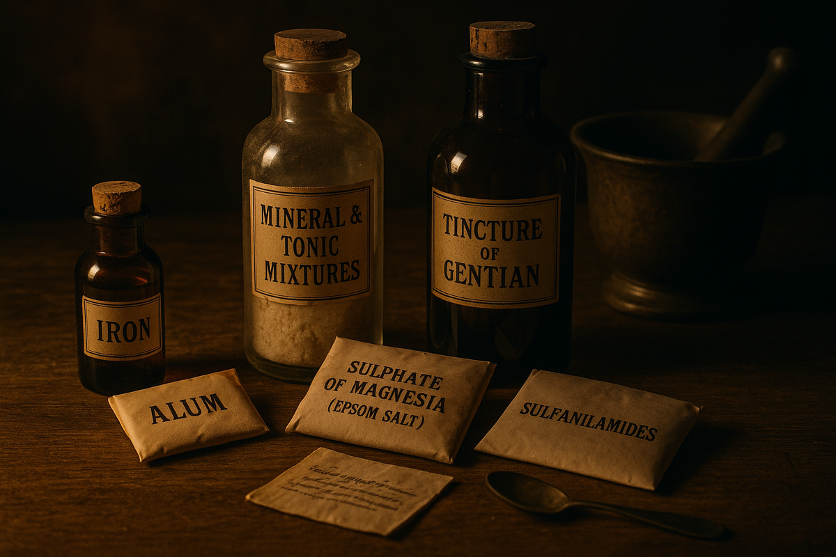 Минеральные и тонизирующие смеси. Железо, квасцы, сульфат магния (“английская соль”), сульфаниламиды и настойки горечавки. Прописывали их, как общеукрепляющие.