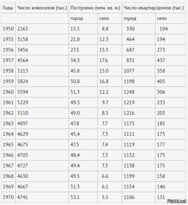 Ниже объяснение и факты. смотри таблицу. и только после хрущева строительство стало расти. Массовое строительство «хрущевок» по всей стране началось с 1959 года, а на индустриальной основе с 1961 года, когда появились первые домостроительные комбинаты. Для строительства многоквартирного дома, включая нулевой цикл и подводку коммуникаций, тогда, как и сейчас, требовалось не менее года. Поэтому заселение кирпичных «хрущевок» началось не ранее 1960 года, а индустриальных – начиная с 1962 года. Следовало ожидать, что массовое получение населением страны новых квартир начнется именно в 1960 году. Соответственно число построенных квартир (домов) и число новоселов в этих новых квартирах (домах) должно было резко увеличиться по сравнению с предыдущим периодом. Однако статистика рисует совсем другую картину.