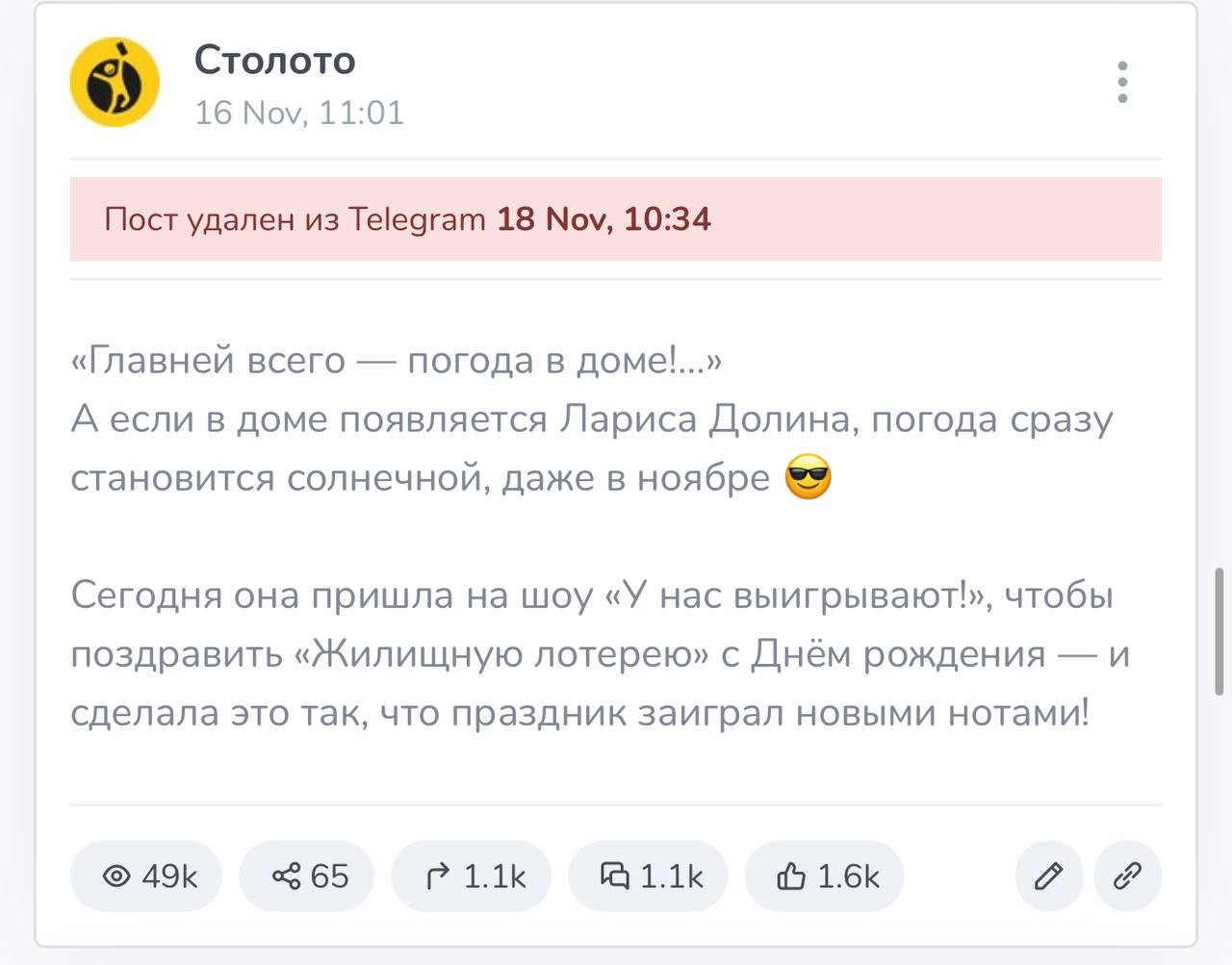 Но недолго музыка играла. После шквала критики в канале «Столото» удалили все посты с Долиной, включая пост от 16 ноября, где она принимала участие в развлекательной шоу-программе.