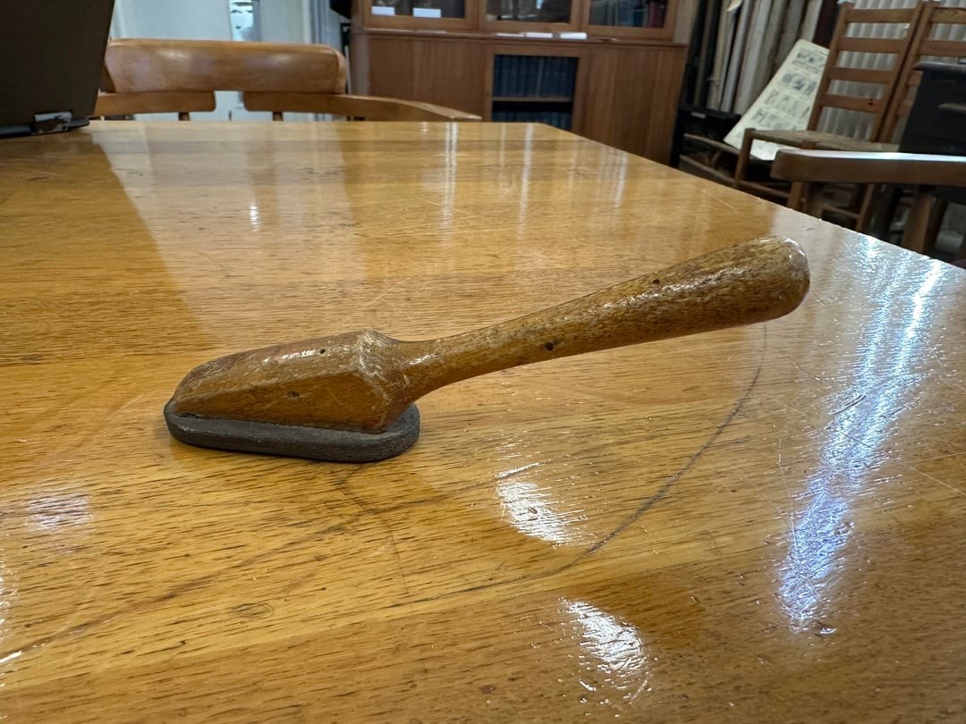 7. Длинная деревянная ручка с металлической пластиной и колёсами на конце