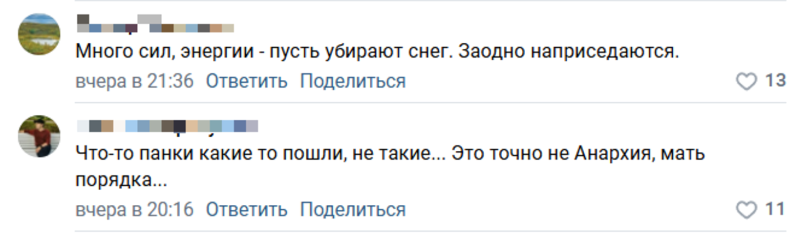 В соцсетях усомнились, что эти бесноватые -панки, а еще заметили, что если молодёжь мается от безделья, хорошо бы её задействовать на общественно-полезных работах. Хотя бы по очистке города от снега - и руки заняты, и дурные мысли в голову не лезут.