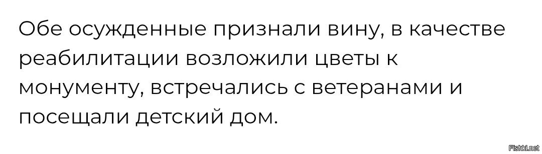 Обе осужденные признали вину, в качестве реабилитации возложили цветы к монументу, встречались с ветеранами и посещали детский дом.