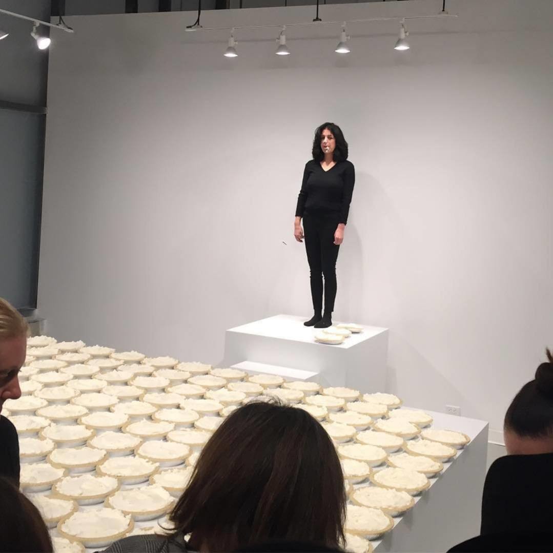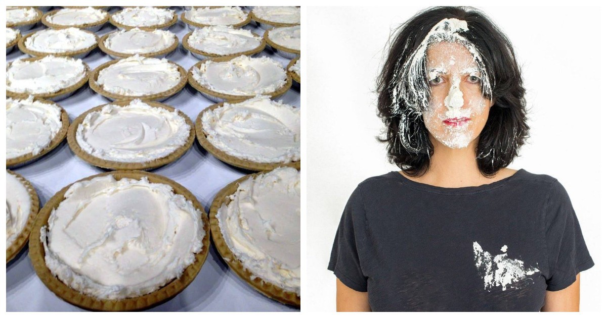 В рамках перформанса художница Дженнифер Рубелл шесть недель стояла на пьедестале, пока посетители бросали в неё пироги. Каждый участник был обязан подписать строгий регламент, разрешающий только один бросок. Уже в день открытия первый же обстрел вызвал у метателя чувство вины и желание поскорее сбежать.