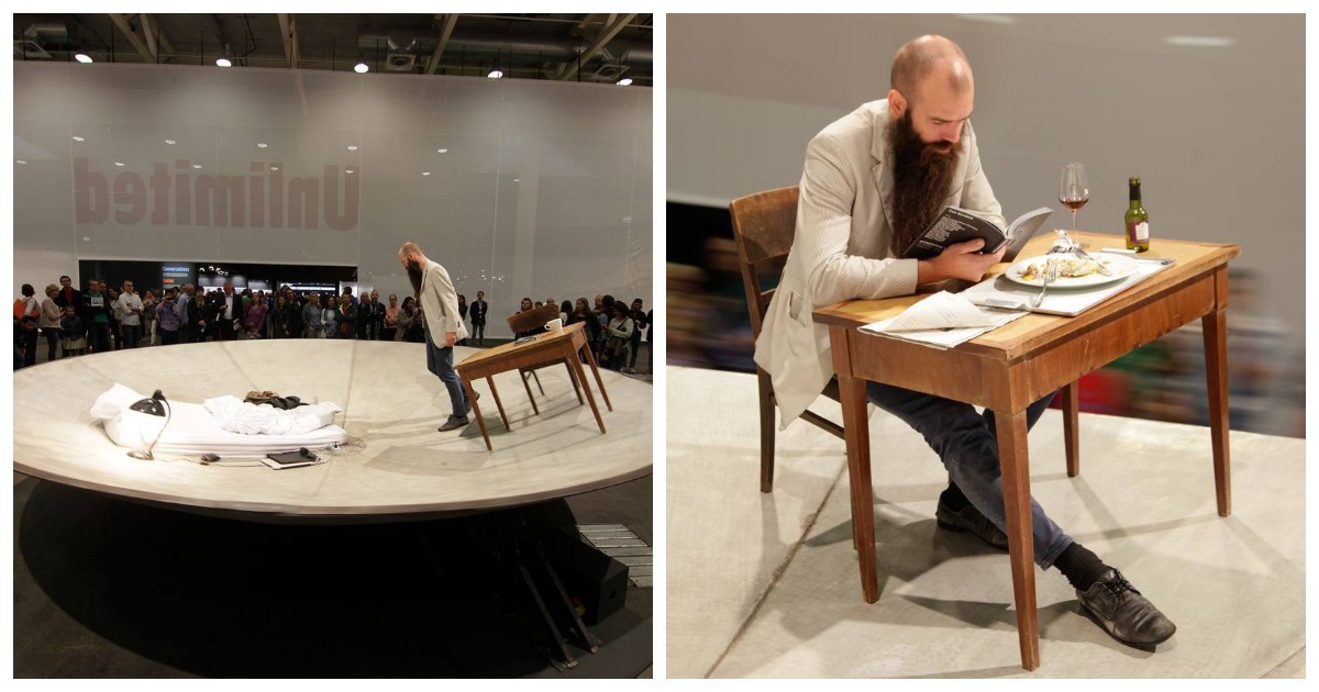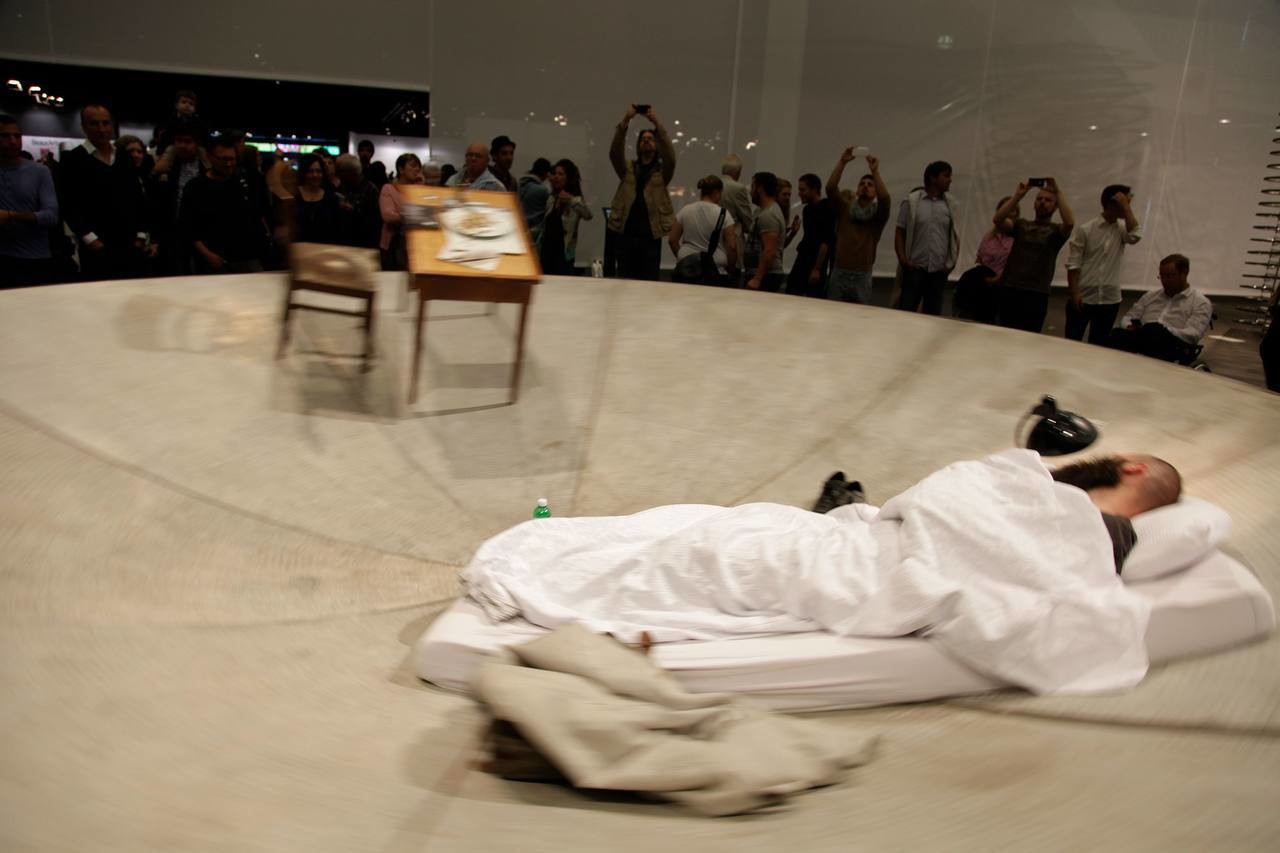 Юлиус фон Бисмарк провёл неделю на вращающейся платформе, выполняя обыденные дела, пока вокруг проносились лица посетителей арт-ярмарки. Платформа вращалась со скоростью 15 оборотов в минуту. Предметы были закреплены, а художник перемещался от матраса к столу.