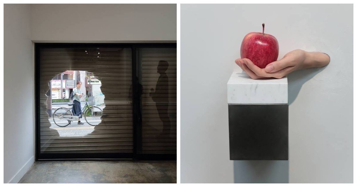Что можно обнаружить, забравшись в заброшенное здание через огромную дыру? Художник Йосукэ Амемия превратил отверстие в портал в альтернативную галерею, где зрителей ждала шокирующая работа — настоящая женская рука, сжимающая яблоко, словно вечное предложение Адаму.