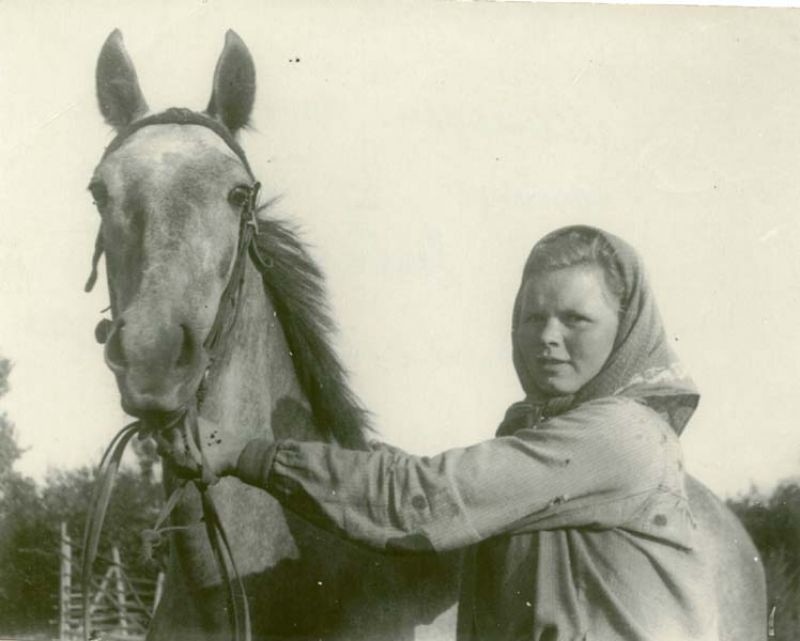 Молодой конюх колхоза «Красный шекснинец» Заботкина с племенной лошадью. 1954 год. Автор: Г. Ефимовский.