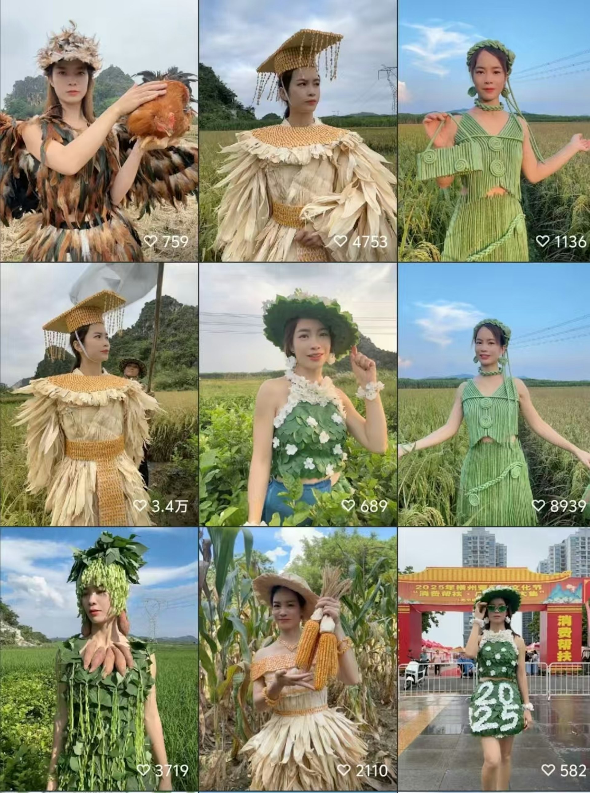 Одним из вирусных стал ролик, в котором девушка демонстрирует платье, полностью сшитое из арахисовой скорлупы. Также оно дополнено галстуком из красной фасоли. Видео, в котором «сельский модельер» разгуливает по полям в таком наряде, собрало более 180 тыс. лайков. В другом она представила наряд в виде дракона из кукурузных листьев и корону из кукурузных зерен, декламируя строки из популярной китайской телевизионной драмы 2015 года «Легенда о Ми Юэ».