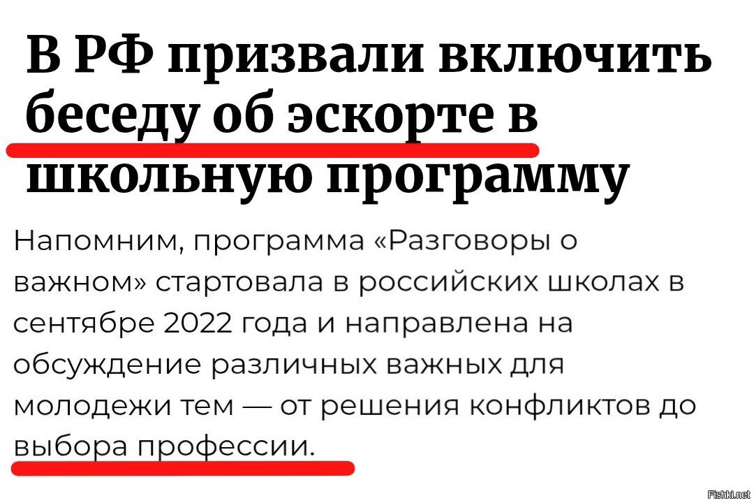 В России предложили включить тему опасности эскорта в программу «Разговоры о важном» — внеклассных обсуждений для школьников, которые проходят по понедельникам. С инициативой выступила председатель Национального родительского комитета Ирина Волынец, отметившая, что многие подростки попадают в эскорт, будучи введёнными в заблуждение обещаниями успешной карьеры модели, особенно через конкурсы красоты.