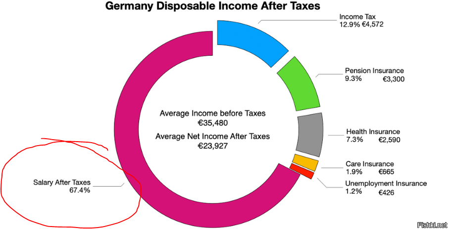 Т.е. с реально заработанного у работника остаётся менее 60% заработанного. А сколько в Германии например у работника уровня нашего "13%го" ? Оппа, 67 % с лишним. Неожиданно, да. Но налоги высокие у них, а у нас низенькие, не то что "там", не перепутайте.