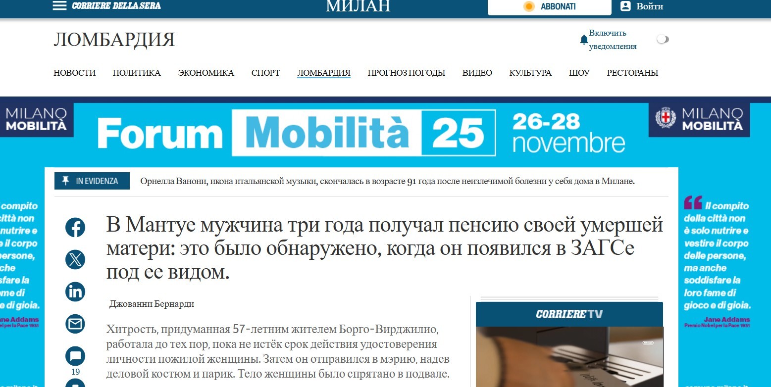В итальянской провинции Мантуя задержали 57-летнего мужчину, который три года жил с мумифицированной мамой в подвале и аккуратно получал её пенсию. История достойна Хичкока, реальнее не куда.