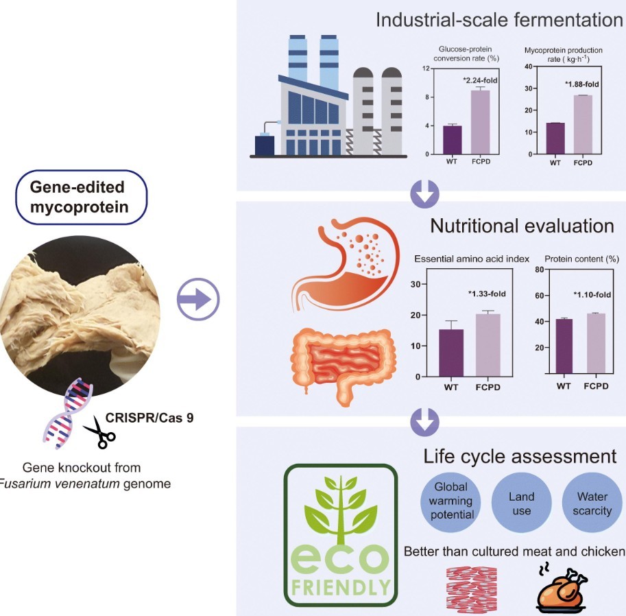 С помощью технологии CRISPR учёные аккуратно «отключили» два гена гриба. Первый отвечает за избыточный синтез хитина, из-за чего стенки клеток стали значительно тоньше и белок теперь усваивается почти полностью. Второй ген контролировал скорость роста и расход питательных веществ: после его деактивации гриб стал расти на 88 % быстрее, а потребление сахара сократилось на 44%.
