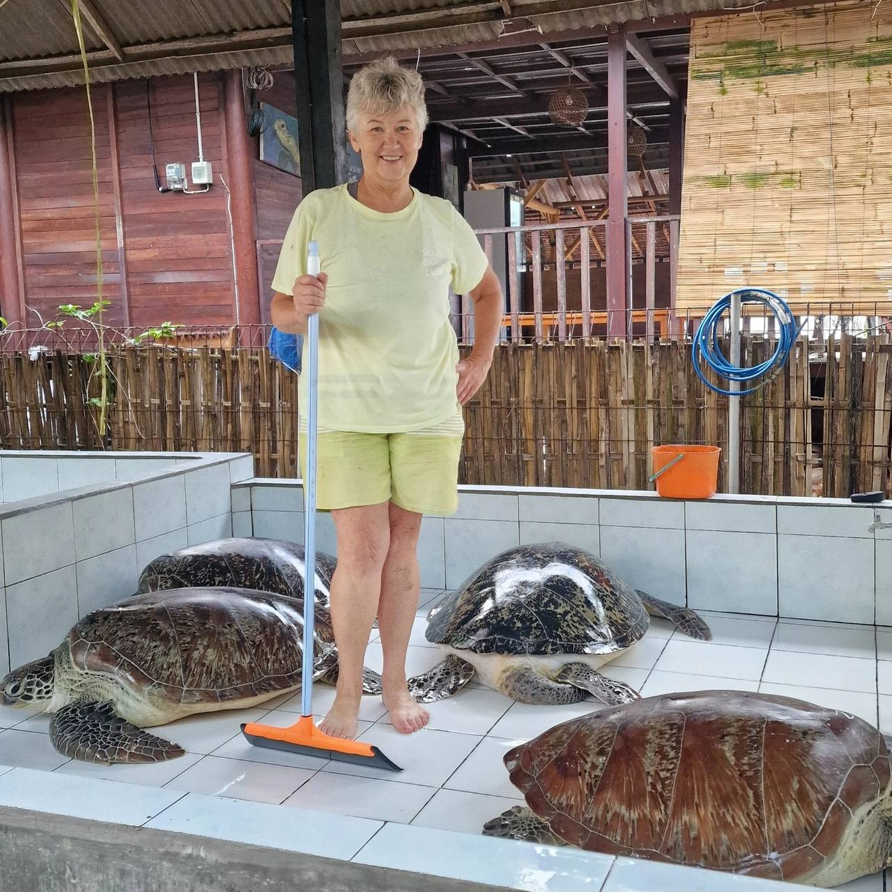 64-летняя Светлана Елкина влюбилась в этих животных после отпуска на Ко Талу. Она стала волонтером и побывала в Италии, Малайзии, Кении, Шри-Ланке и Таиланде, а затем остановилась в Индонезии. В числе прочего Светлана помогает новорожденным черепашатам добраться до воды, ухаживает за ранеными и дежурит ночью на пляжах, защищая кладки.