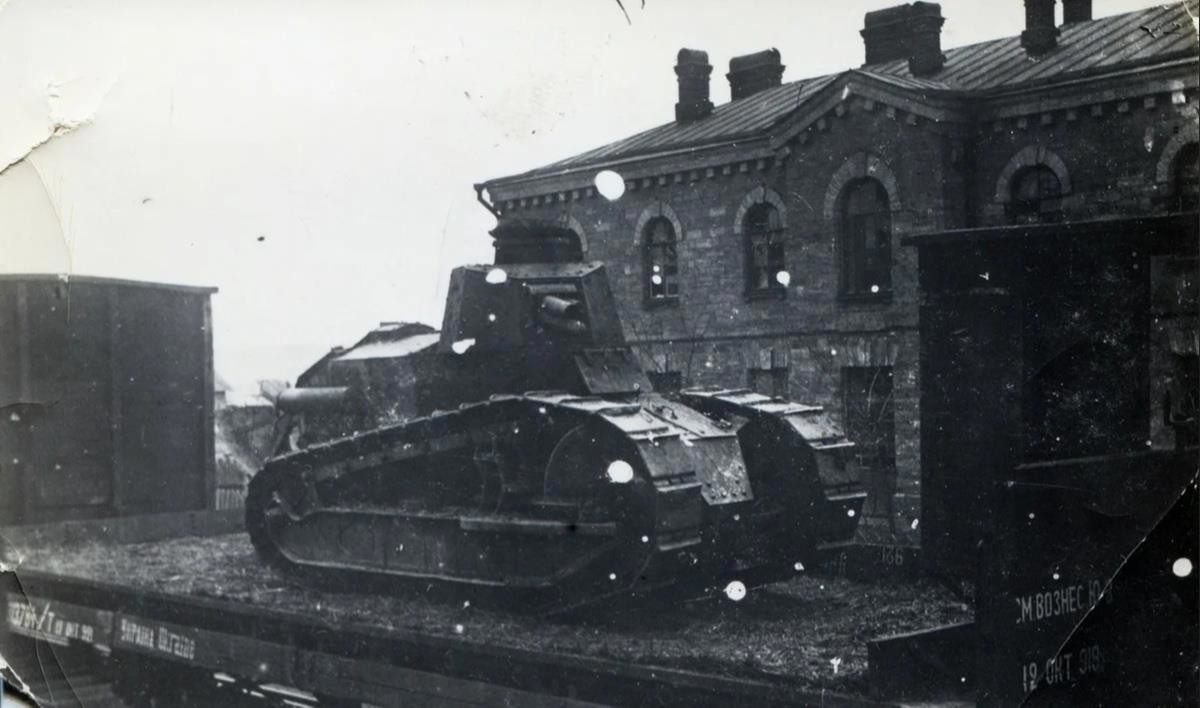 Захваченный красными белогвардейский танк «Рено» FT-17 в Вознесенске перед отправкой в Харьков. 1920 год.