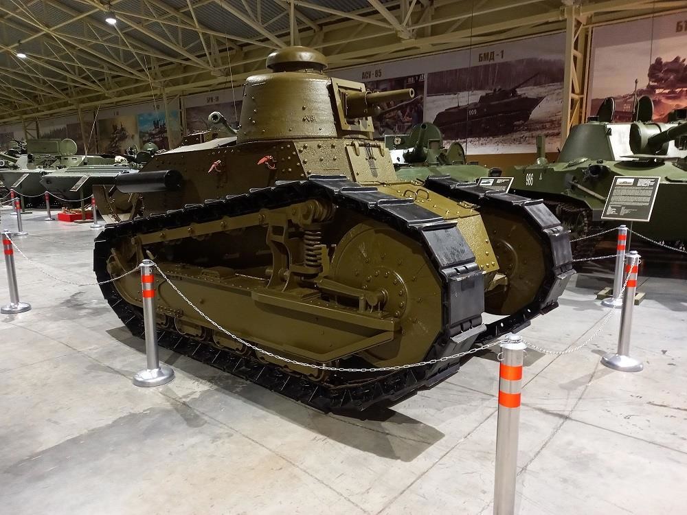 И в наше время, в современной России остался всего один танк. Что демонстрируется сейчас на Поклонной горе. Причём родной у него только корпус. Так как в 1938 году на полигон в Кубинке был доставлен корпус одного из первых трофейных танков типа «Рено» FT-17. Почему первых? А потому что с 1939 года пошла вторая волна трофеев этих машин. И именно с танка захваченного в Польше в 1939 года на него и установили башню. При этом направляющее колесо этого танка выполнено из дерева. Единственный случай применения этого материала в конструкции танков.