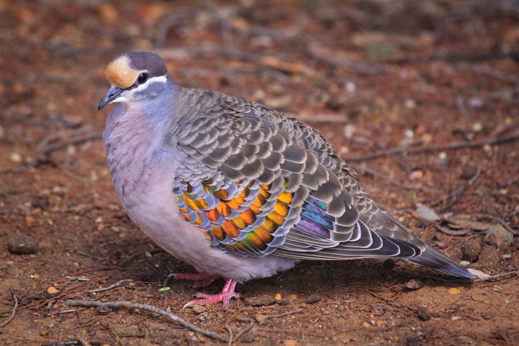 Эти австралийские голуби широко известны как бронзовокрылые. Их отличительная черта — переливающиеся участки на крыльях, которые при попадании света отливают бронзовым и разными другими цветами.