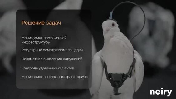 Российская биотех-компания Neiry сообщила о разработке голубей-биодронов, оснащённых нейроинтерфейсами, посредством которых полётом птицы можно управлять дистанционно. Сообщается, что «живые дроны» могут использоваться для промышленного, экологического мониторинга, а также помогать в поисково-спасательных операциях.