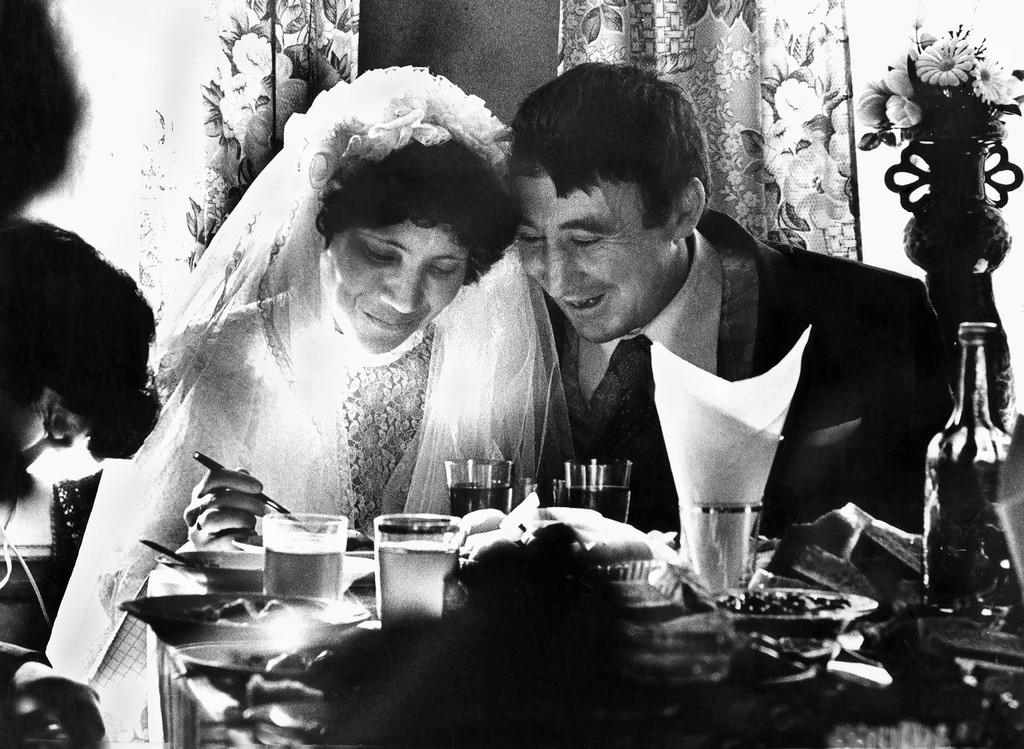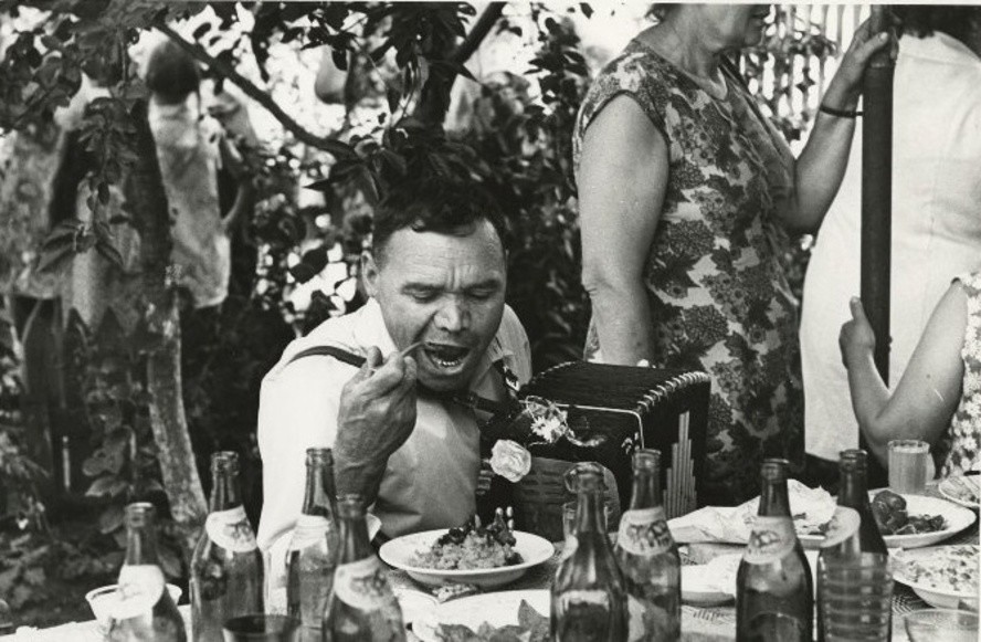 «Не следует стараться есть в гостях мало. Ешьте в меру своего аппетита». Фото: Гармонист. 1970-е. Автор: Юрий Рыбчинский.