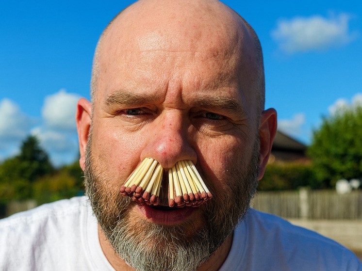 Он вписал своё имя в Книгу Гиннесса, засунув в ноздри сразу 81 спичку — и тем самым побил установленный ранее рекорд. Раньше планка была на отметке 68.