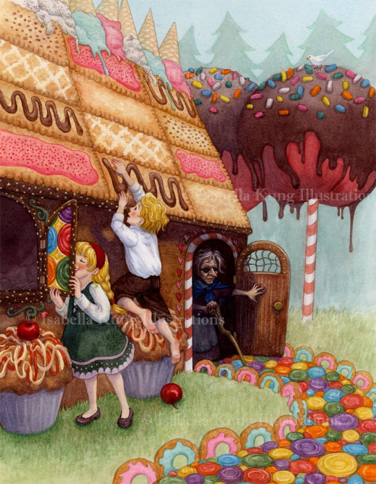 Подойдя к избушке поближе, они увидели, что она вся из хлеба построена и печеньем покрыта, да окошки-то у нее были из чистого сахара.