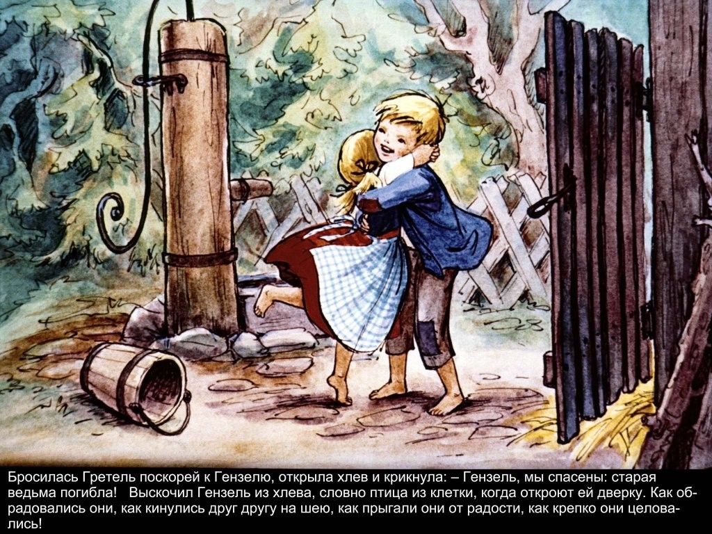А Гретель тем временем прямехонько бросилась к Гензелю, отперла клетку и крикнула ему: «Гензель! Мы с тобой спасены!»