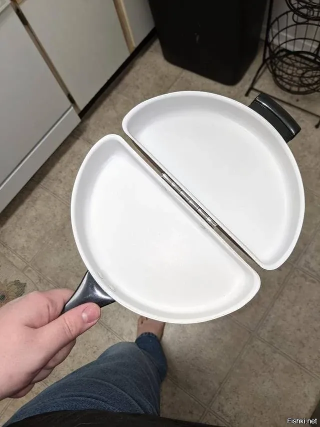 Такие сковородки были популярны в 1970-1980-х годах. Вы готовите омлет с одной стороны, а затем переворачиваете сковороду, чтобы он поджарился с другой стороны.