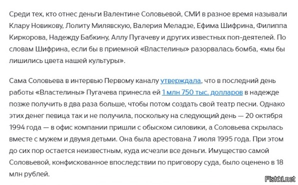 3. А что касается Долиной, то я не верю, что человеку её уровня можно было пудрить мозги сколько ни будь продолжительное время, да так, что её ближний круг (продюссеры, юристы, бухгалтеры, и т.п.) ничего не заметили. Или сами мошенники люди из её круга, но это уже другая история.