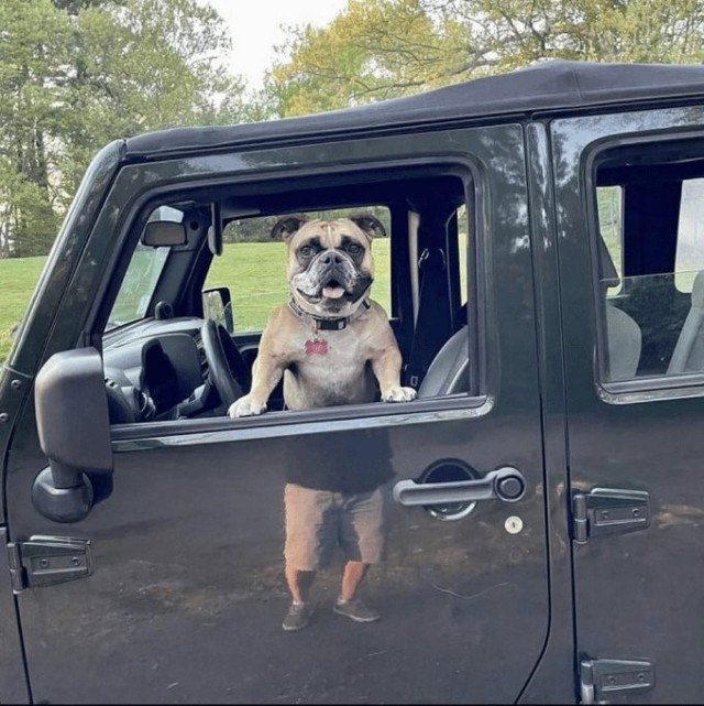 Приходится выкручиваться подручными средствами! Вы только посмотрите на это идеальное попадание в "седло" и на "педали". Взгляд пса полон решимости: сейчас он докажет всему миру, что четыре лапы плюс два нарисованных колеса — это страшная сила! Эх, прокачу!