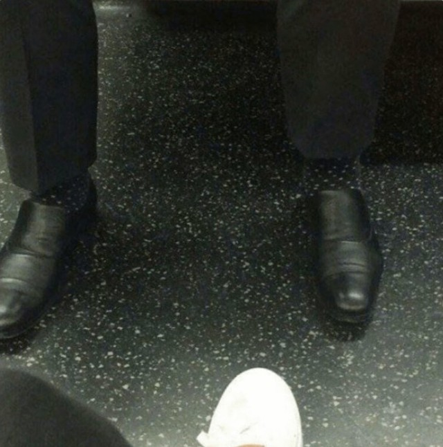 Кажется, мы нашли человека-невидимку, который, к сожалению, начал исчезать не целиком, а частями! Глядя на этот кадр, глаза отказываются верить: ботинки стоят, брюки висят, а между ними — зияющая пустота. Вот что значит идеальный камуфляж — в таких носках можно не только слиться с интерьером, но и заставить попутчиков в метро украдкой креститься, глядя на ваши одиноко парящие туфли.