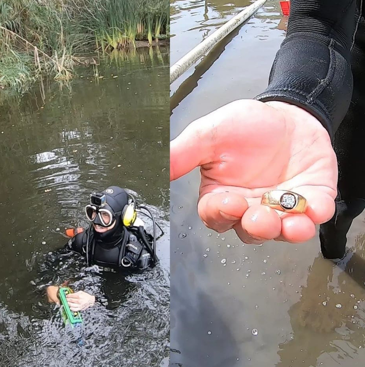 Меня пригласили понырять с аквалангом в озере, находящемся в частном владении, с целью поиска потерянных там ценных вещиц. Поиски увенчались успехом: драгоценности были найдены. Среди них было и это обручальное колечко стоимостью 5 тысяч долларов, потерянное пять лет назад.