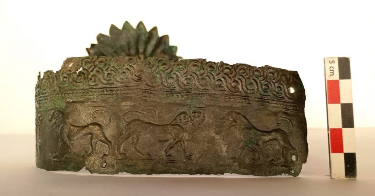 На голове женщины была искусно сделанная бронзовая диадема с парой геральдических львов — мужского и женского пола — символов верховной власти во всём древнем Средиземноморье. В центре украшения когда-то сияла большая розетка в форме солнца, что свидетельствовало о ранге, престиже и, возможно, даже о королевском происхождении.