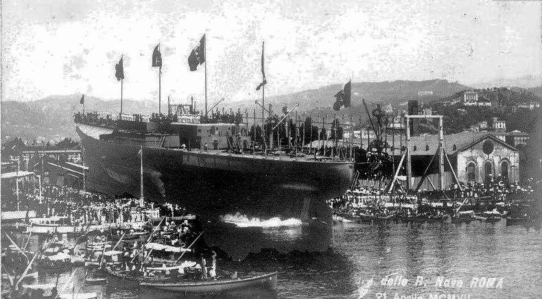 Roma стал третьим кораблём серии. Первые два были внесены в бюджет 1901 года, а вторые — на 1902 год, хотя реальная закладка Roma и его систершипа Napoli состоялась только в 1903 году.