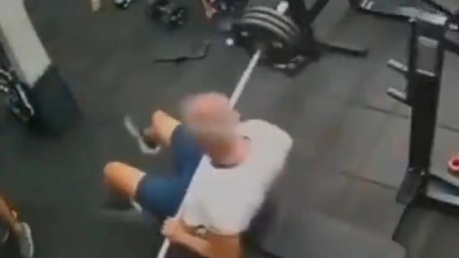 Мужчина сумел сбросить штангу и даже подняться, но уже через мгновение рухнул. Видно, как работники и посетители зала бросились ему на помощь.