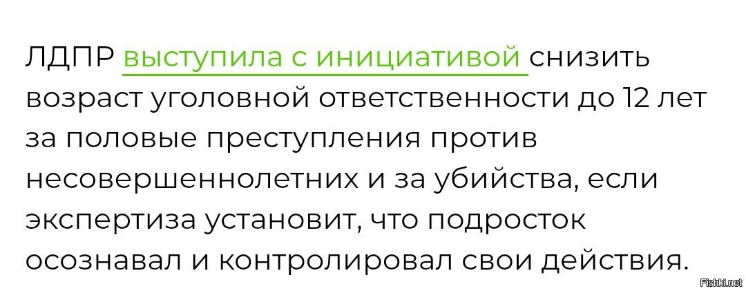 ЛДПР выступила с инициативой снизить возраст уголовной ответственности до 12 лет за половые преступления против несовершеннолетних и за убийства, если экспертиза установит, что подросток осознавал и контролировал свои действия.