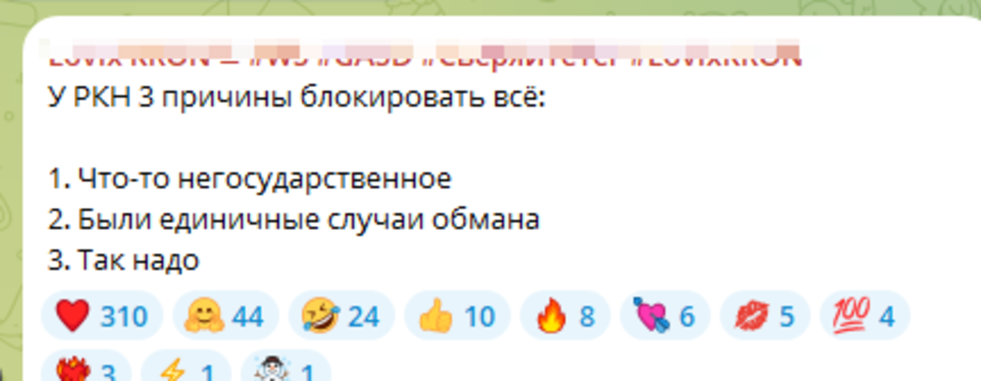 Между тем Екатерину Мизулину, которая ведёт постоянный диалог со школьниками и студентами, тревожит эта ситуация с блокировкой. Глава Лиги безопасного интернета заявила, что наблюдает нехорошие последствия этих решений РКН: по её словам, каждый второй подписчик её Телеграм-канала от 8 до 16 лет после блокировок платформ стремится покинуть Россию.