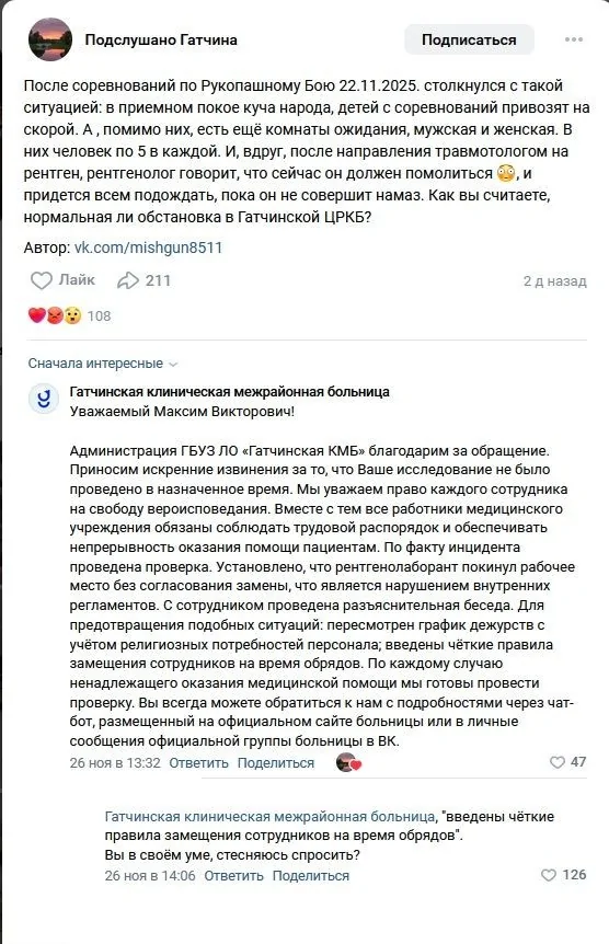 Напомним, в администрации клиники в Гатчине хоть и принесли извинения пациентам, которые были вынуждены ожидать рентгенолога, удалившегося на намаз, заявили, что в будущем более тщательно подойдут к планированию рабочего дня своих сотрудников, чтобы молитва не мешала исполнению их профессионального долга.