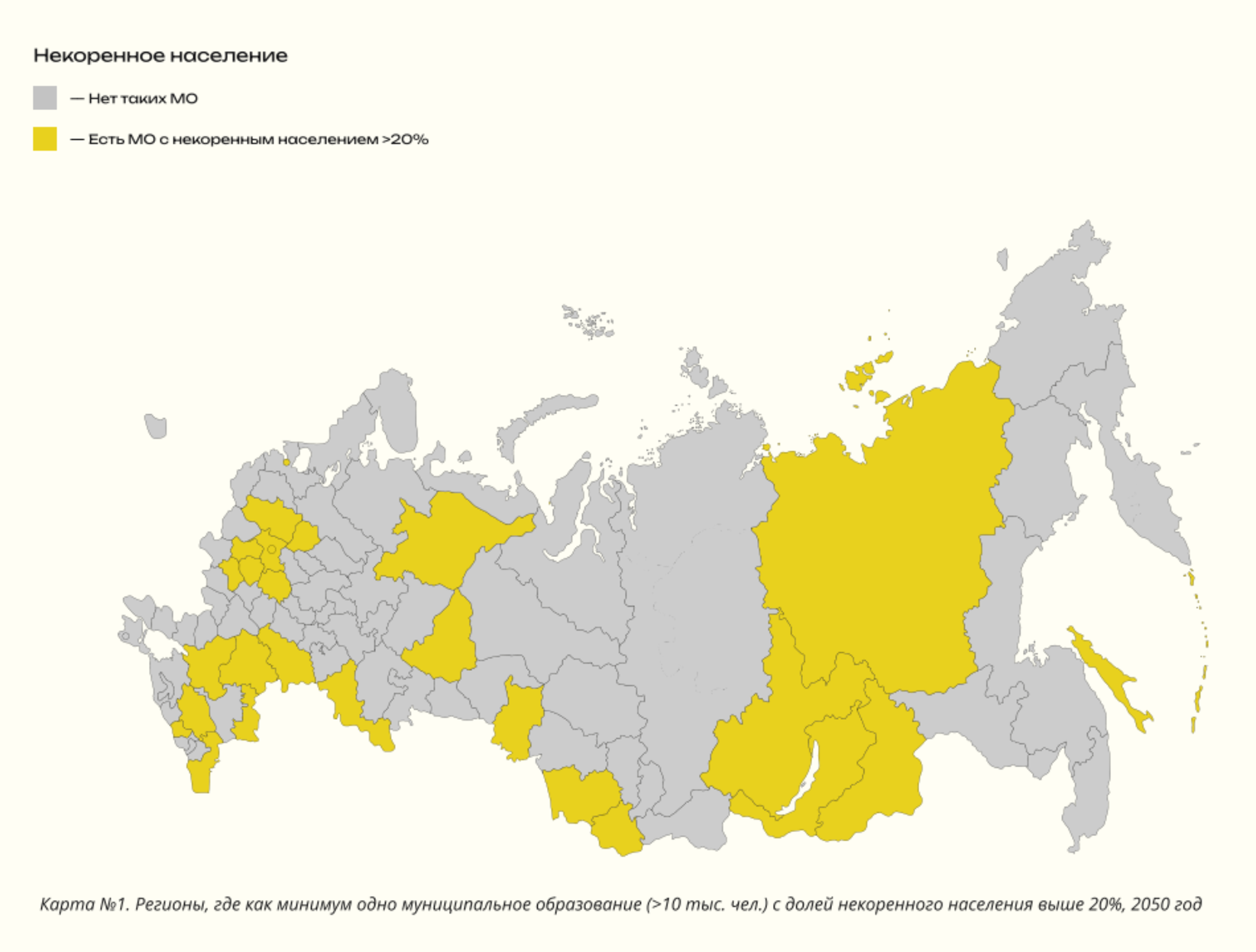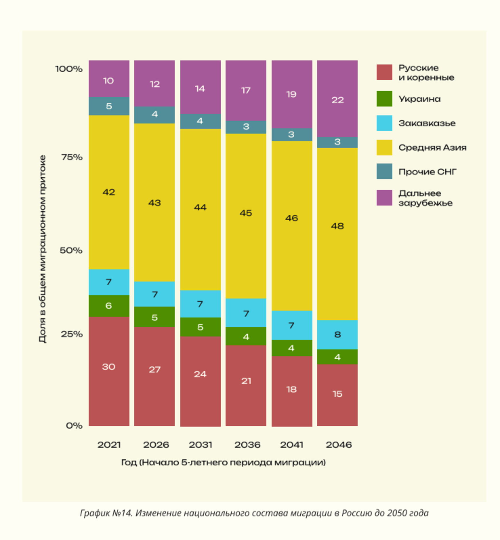 Согласно пессимистичному сценарию, доля некоренного населения в России вырастет с 5% до 13%, а каждый шестой ребенок в стране будет из семьи мигрантов. Особенно много мигрантов будет в крупных городах, к 2050 году до четверти жителей Москвы может иметь мигрантское происхождение - подобное авторы прогноза наблюдают в Западной Европе, Британии, и эти тенденции наверняка не обойдут и Россию. В некоторых регионах доля мигрантского населения может достичь 20-50%.