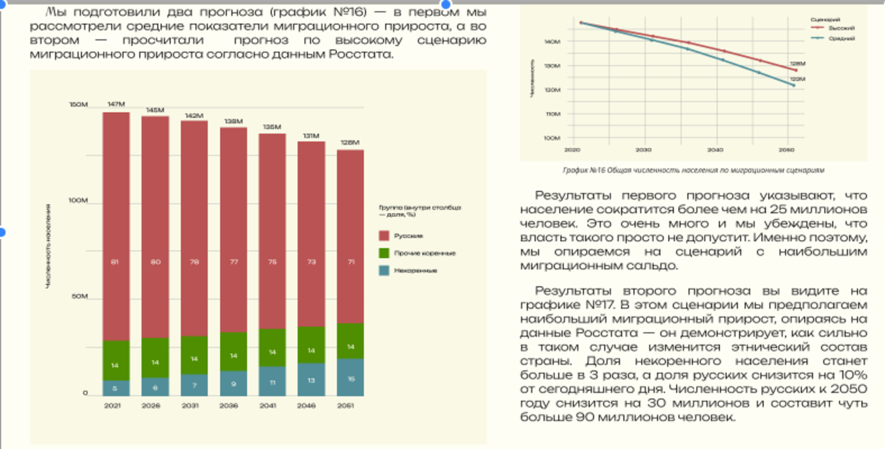 Аналитики ЦАМТ отмечают, что по сравнению с переписью 1989 года количество русских в России уже уменьшилось на 13%: с 145,2 до 126,6 миллиона человек. В новом прогнозе моделируются дальнейшие изменения этнического состава с учетом текущих трендов и опыта миграции во Франции и Германии.