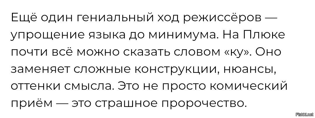 "На Плюке почти всё можно сказать словом «ку». Оно заменяет сложные конструкции, нюансы, оттенки смысла. Это не просто комический приём это страшное пророчество."