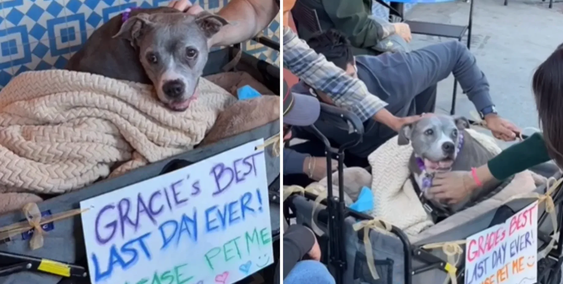 Хозяева уложили ее в повозку, застеленную одеялами, и прикрепили табличку с надписью: "Лучший последний день в жизни Грейси. Пожалуйста, погладьте меня". Их маршрут начался с первой кофейни, куда Майкл привел ее в день, когда она стала его собакой.