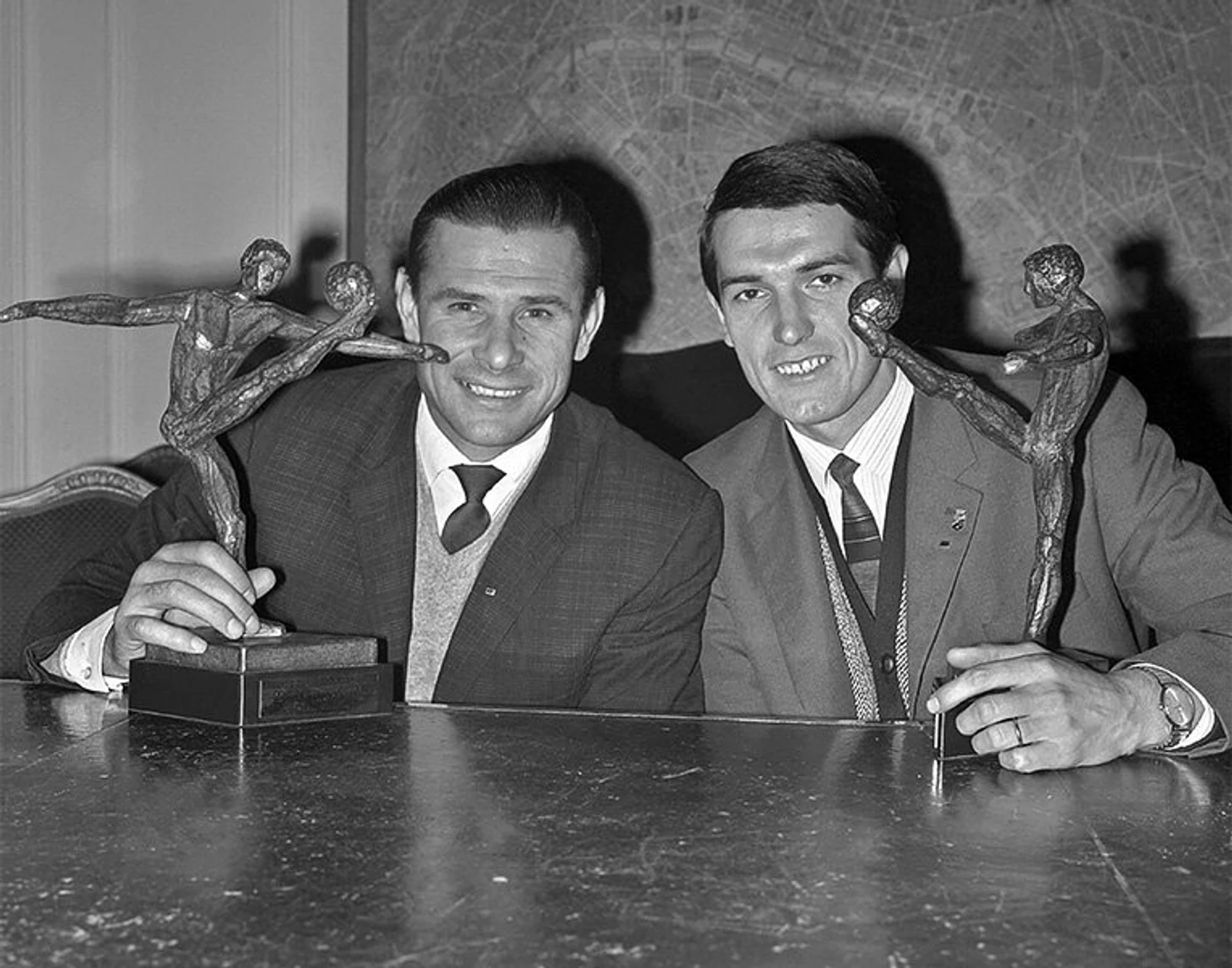 Вратарь сборной СССР Лев Яшин и полузащитник Валерий Воронин с футбольными "Оскарами" за свои достижения.