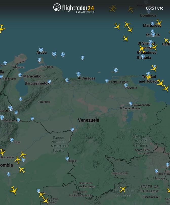 Так выглядит венесуэльское воздушное пространство по данным Flightradar. В небе не наблюдается ни одного самолёта.