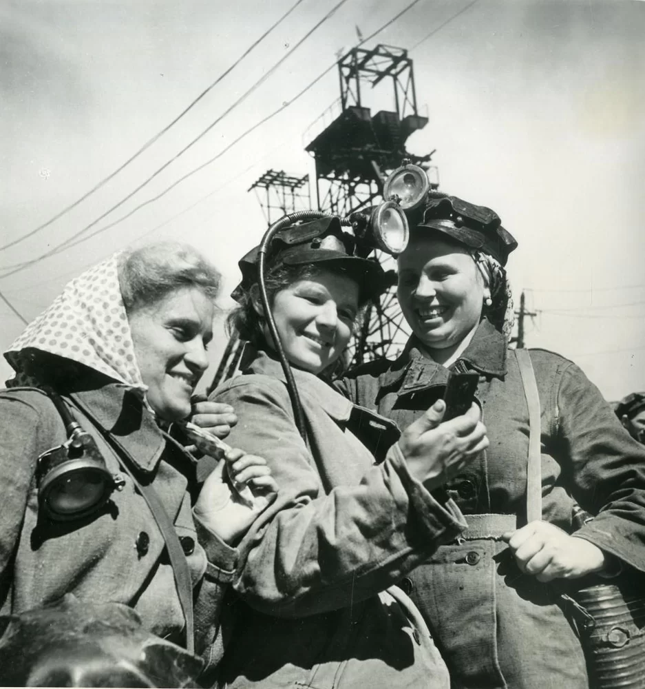 Мотористки Ф.Н. Казакова, В.В. Лазарева и Е.С. Харитонова перед спуском в шахту.